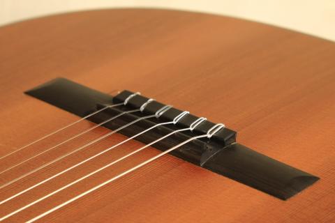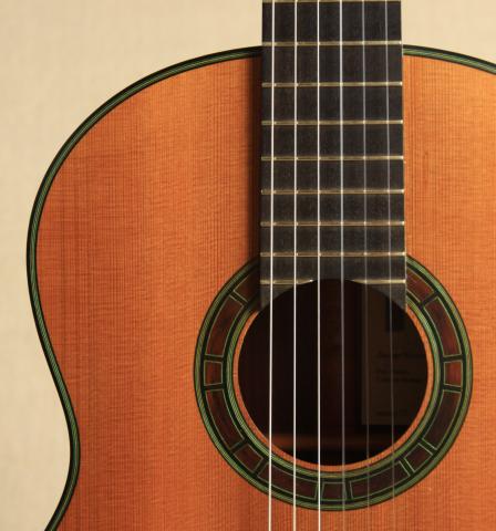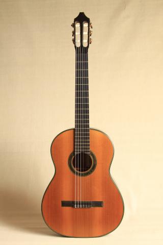 The top is cedar, thinner than normal, with satin lacquer finish. The top has been re-finished recently to remove marks and wear from 6 years of playing. New Waverly tuners and a new fiberglass flight case have been added to bring this guitar up to almost new condition. This model instrument made new is $7500, this great guitar is available for $6000 through this site.