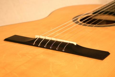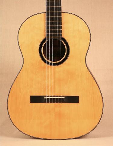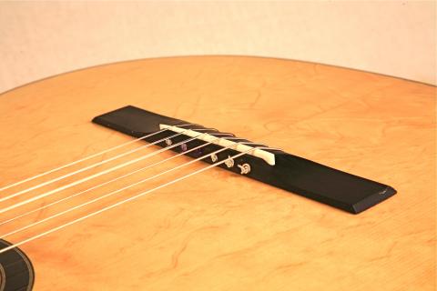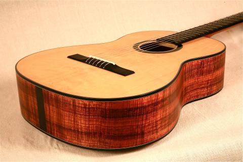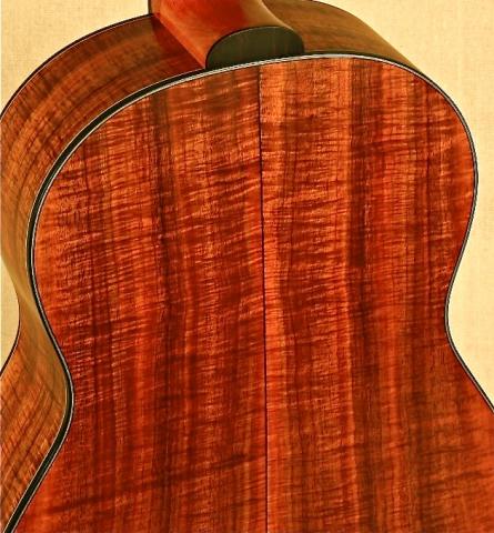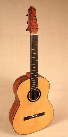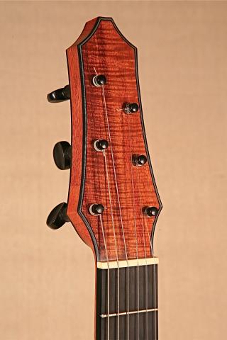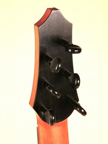 This design incorporates 19th century LeCote style construction features into the larger modern body and scale. Bracing of top and back reflects the lateral bracing systems of those earlier instruments making strong highs and mids with evenness of tone across the range - like a LeCote's bigger brother. Although this instrument seems to use original wooden pegs for tuning they are actually PegHed tuning machines with 16:1 internal gearing - same as modern machines. The figured Koa body wood imparts a tone color similar to the Maple of original instruments.